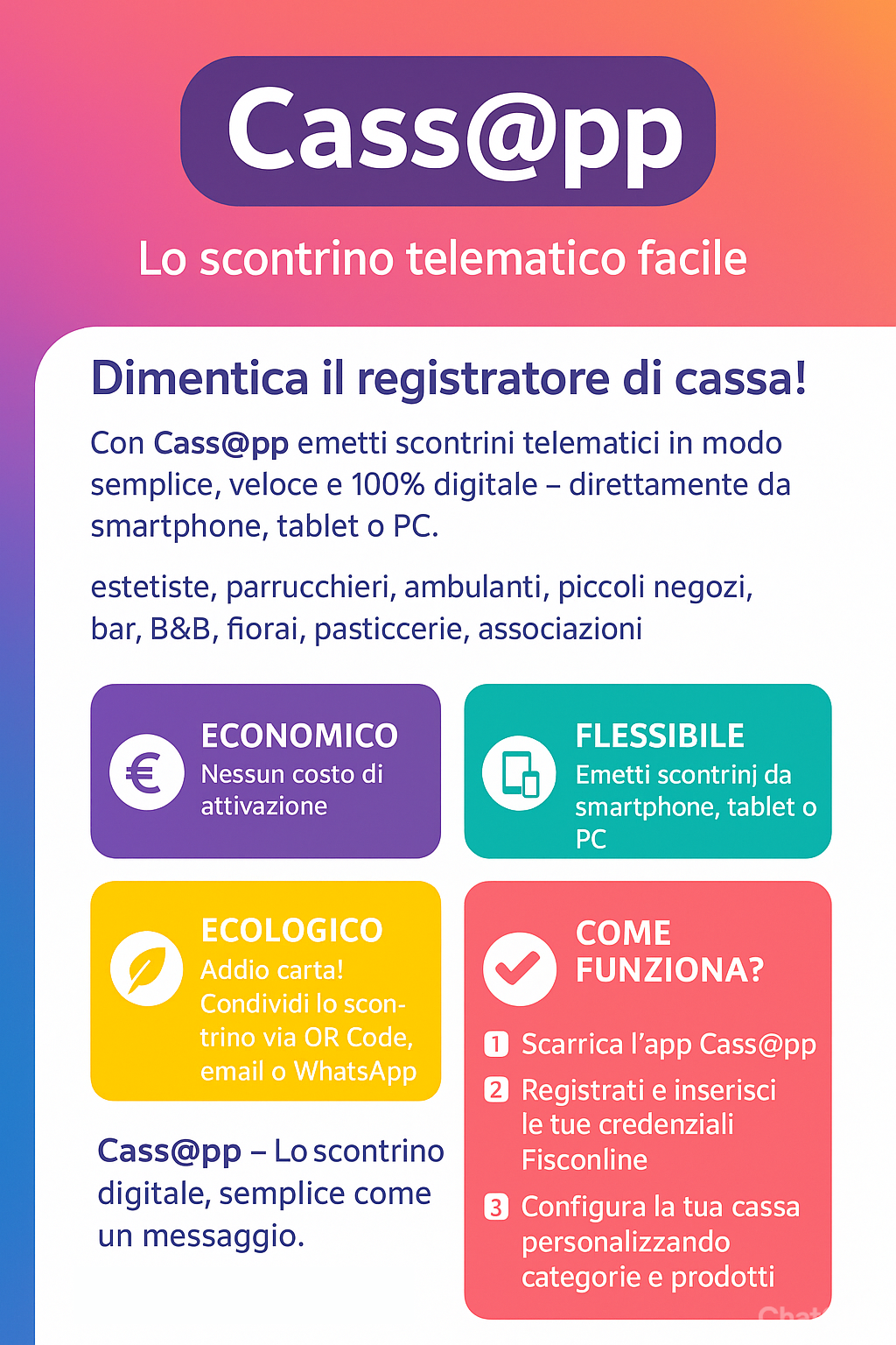 In un mondo digitale anche il registratore di cassa fa un balzoni avanti; Cass@pp ti prende per mano e ti porta verso questo mondo tra flessibilità permettendoti di utilizzare un semplice smartphone come registratore di cassa ed ecologia evitando la carta dei vecchi scontrini, passando dalla semplicità dell’utilizzo dell’app .